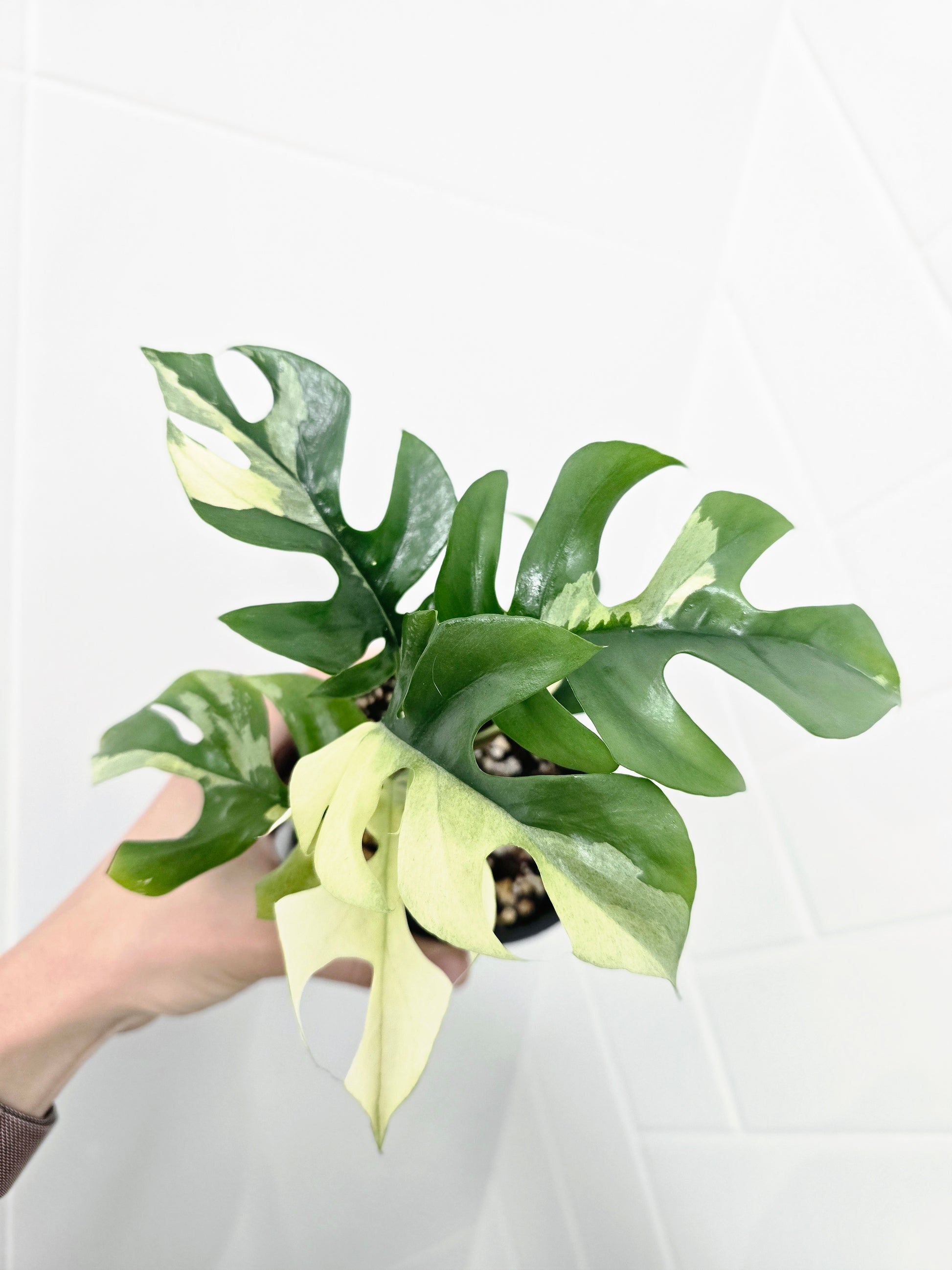 The Variegated Rhaphidophora Tetrasperma is a rare and highly coveted aroid, prized by collectors for its striking foliage and strong growth habit. Its distinctive split leaves showcase a stunning blend of rich green, creamy white, and soft golden variegation, creating a bold visual statement in any indoor space.