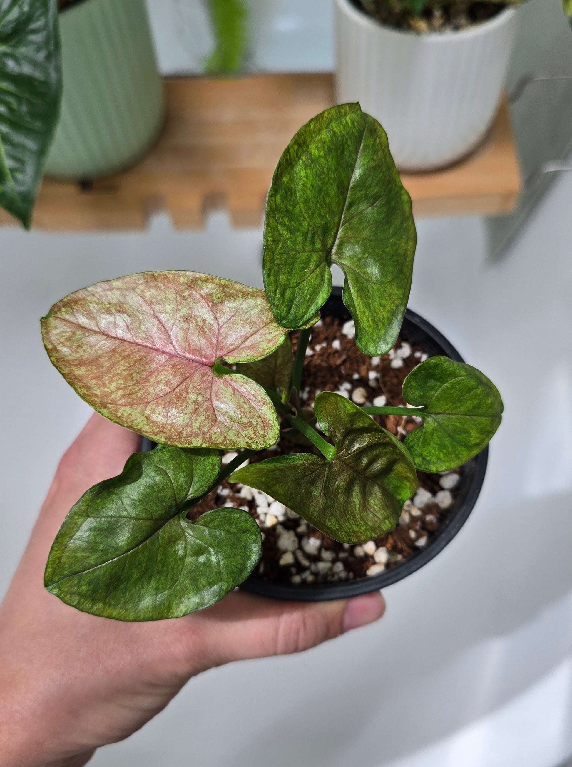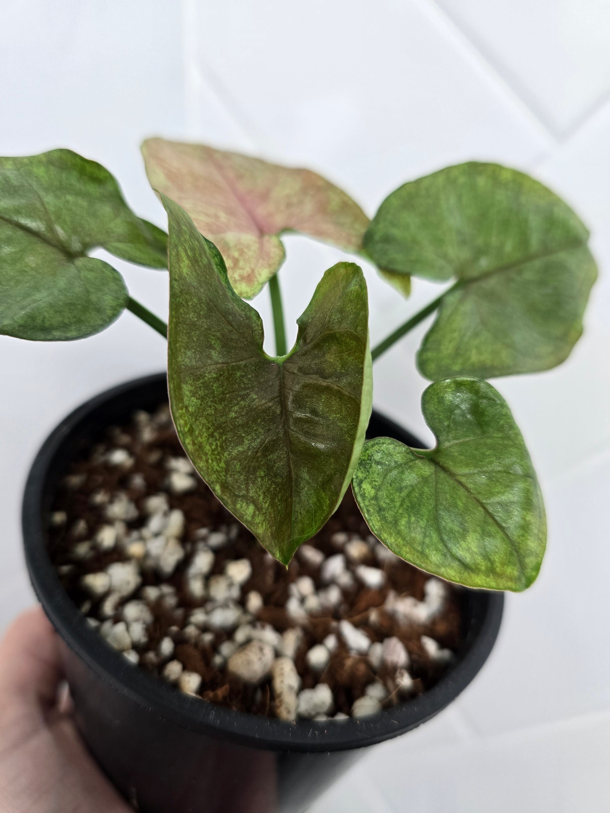 Say hello to your next leafy obsession: Syngonium Podophyllum ‘Matcha Sprinkle’. This unique and highly collectable Syngonium puts on a stunning display as each new leaf emerges in soft blushy red-pink tones, delicately freckled with speckles. As the foliage matures, it settles into a rich green base with increasingly pronounced spotting—truly reminiscent of matcha powder lightly dusted across the leaves.